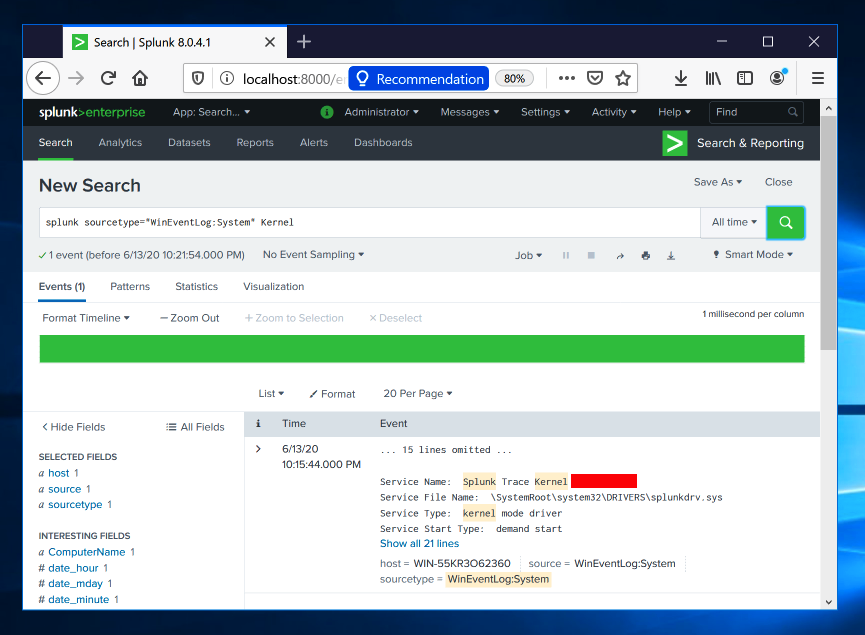 In the sourcetype box, click WinEventLog:System.in the Search bar, add the word Kernel