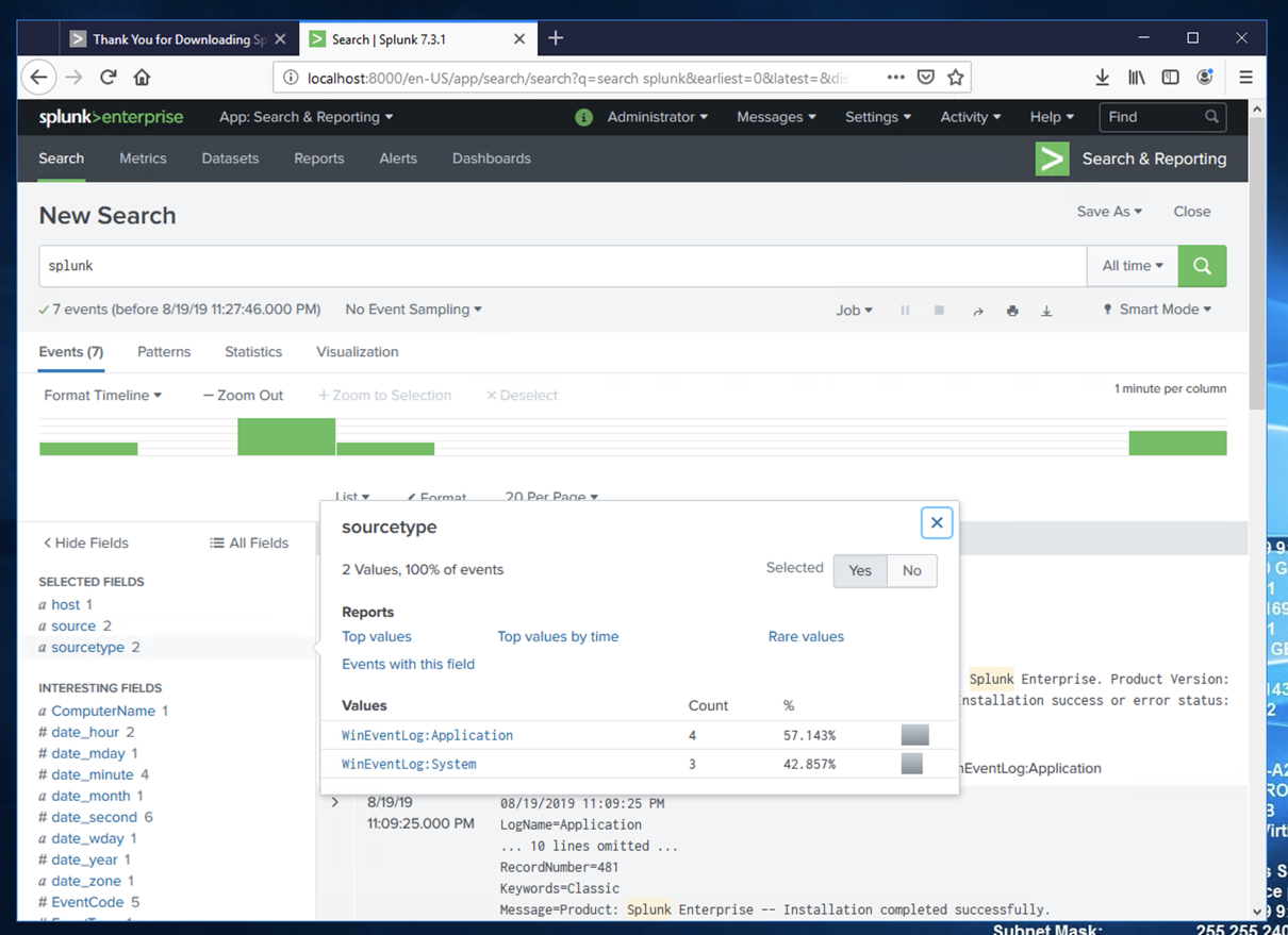 Events about splunk appear, as shown below.