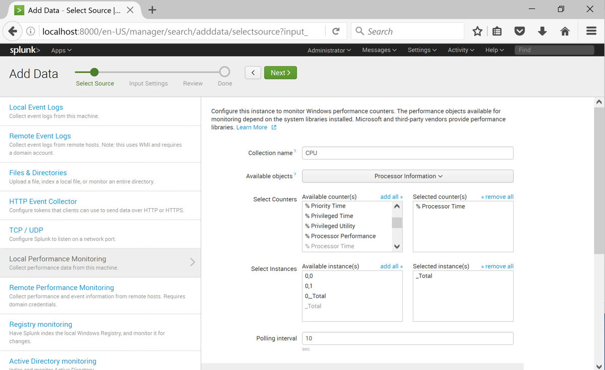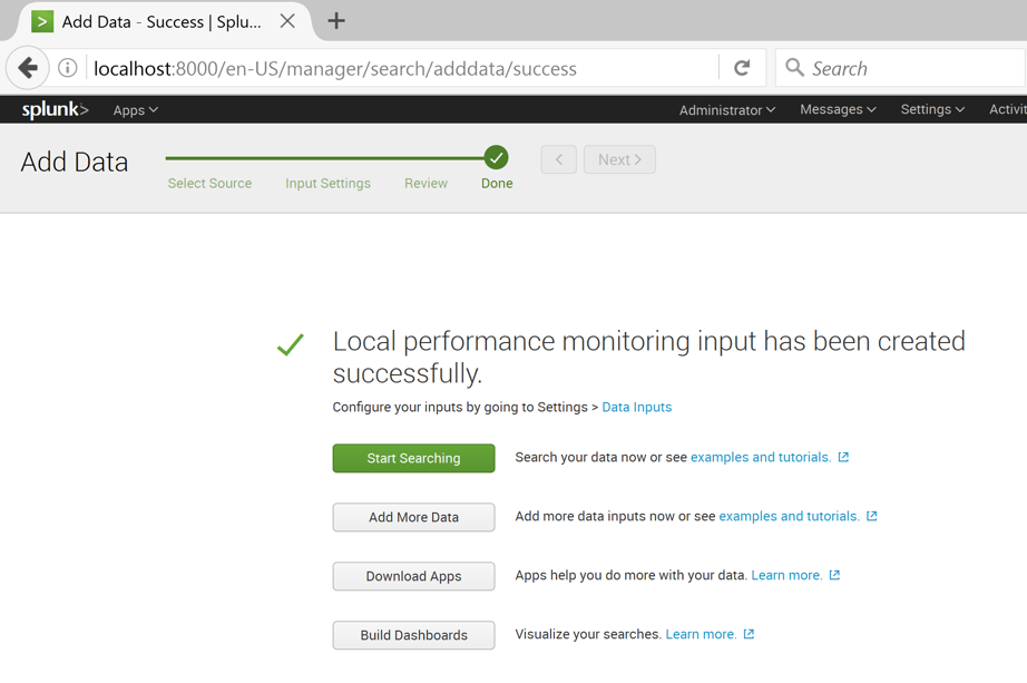 A page appears saying "Local performance monitoring input has been created successfully" as shown below.