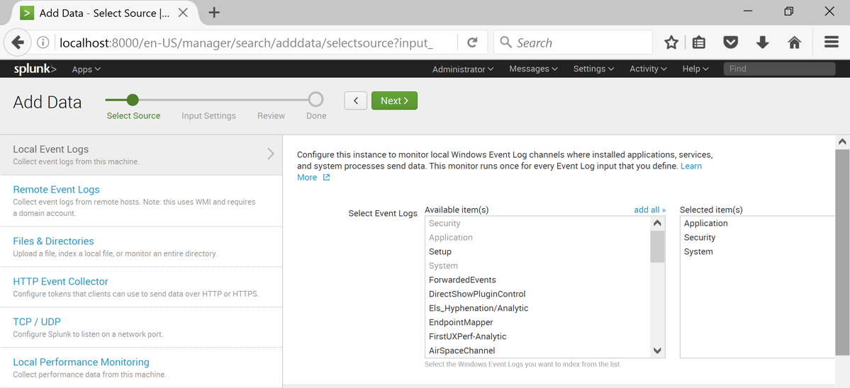 In the right pane, select these three logs, as shown below:
