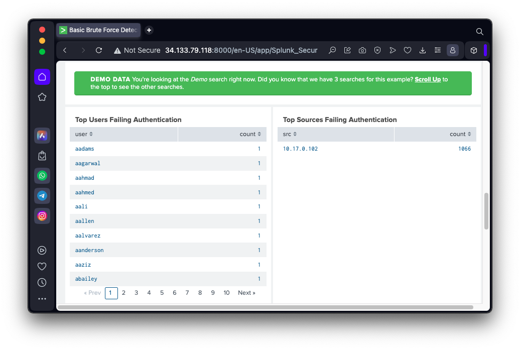 Many usernames were used, as shown on the left side, and 1066 logins were attempted from the same IP address, as shown on the right side.