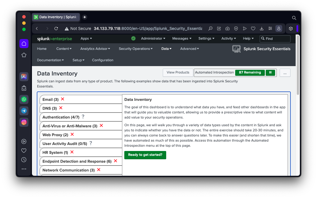 On the left side, red X marks appear next to each item, because this Splunk server isn't collecting any data yet, as shown below.