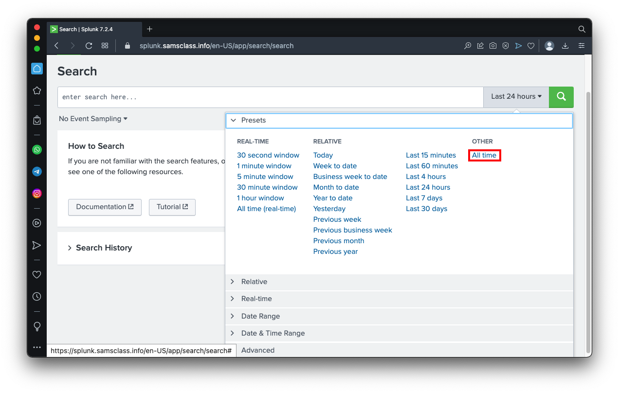 - Use the "Date time range" option of Search to narrow the time range to just a few seconds before the Suricata alert. Check to make sure you can still find the Suricata alerts. You may have to adjust the time by am hour or two to compensate for time zone differences.
