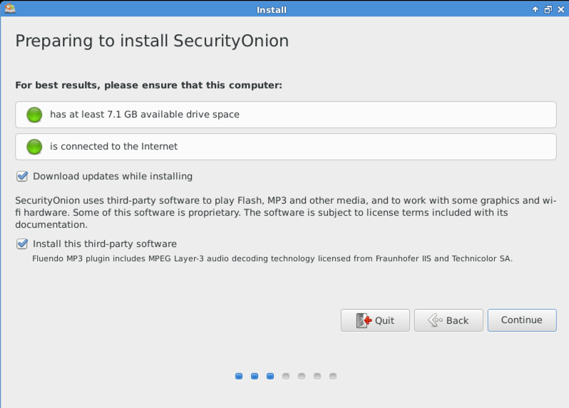 In the "Preparing to install SecurityOnion" screen, check both boxes, as shown below, and click Continue.