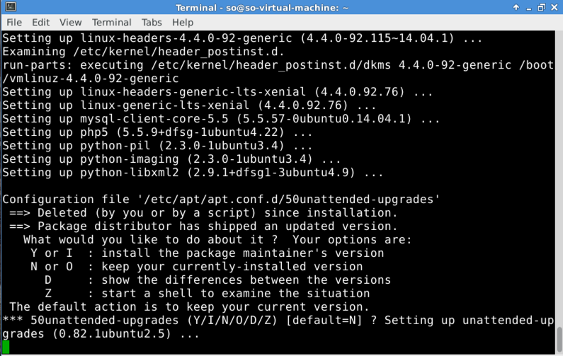 When the installer prints a question about unattended upgrades, as shown below, press Enter.
