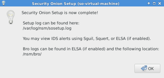 When you see the message "Security Onion Setup is now complete!", as shown below, click OK.