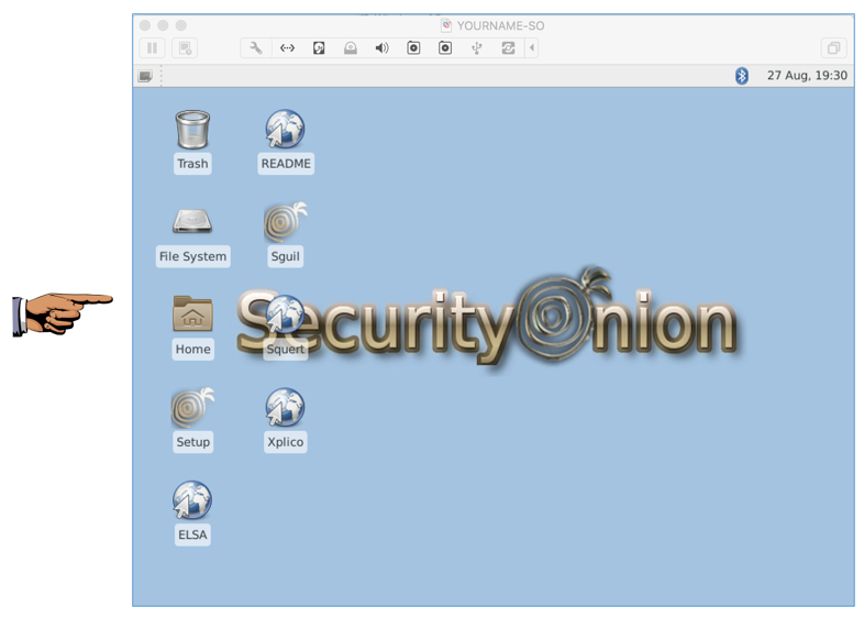 Click OK five more times. The SecurityOnion desktop appears, with several icons on it, including Sqert, as shown below.