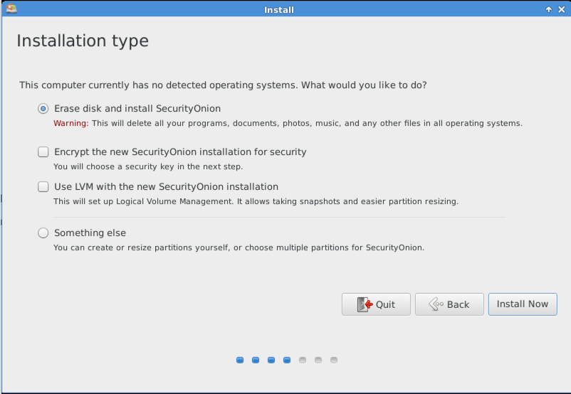 In the "Installation type" screen, accept the default selection of "Erase disk and install SecurityOnion", as shown below, and click "Install Now".