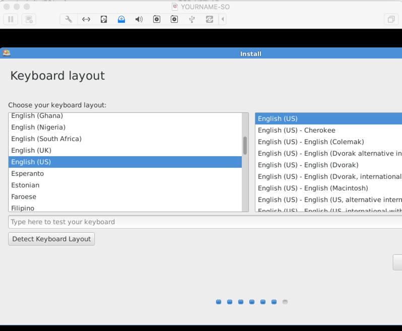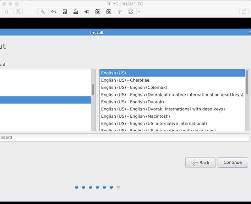 The next screen is titled "Keyboard layout", and it's too big to fit on the desktop, as shown below. This is a common problem with graphical Linux installers.