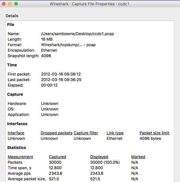As shown below, this file contains 30,000 packets, captured over a period of 12.8 seconds in 2012.