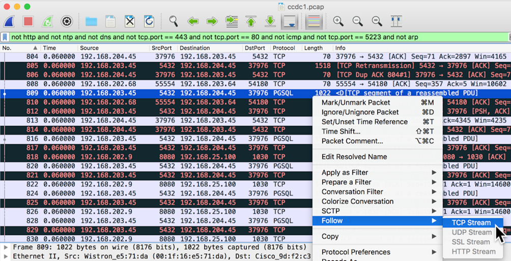 Packets 809 and 816 are interesting--they use PGSQL, a database protocol. To see what that traffic is, right-click packet 809 and click Follow, "TCP Stream", as shown below.
