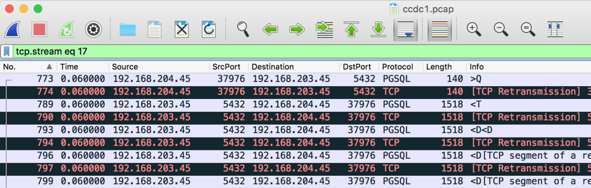 The filter changes to tcp.stream eq 17 as shown below. Only the PGSQL stream is displayed.