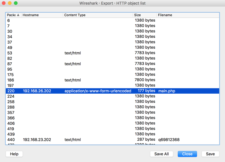A list of all the objects transferred via HTTP appears, as shown below.