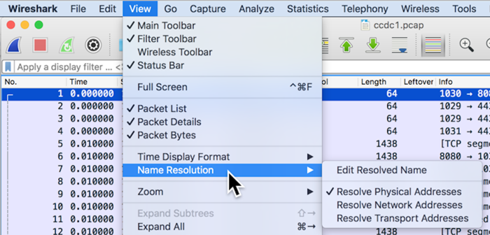 From the Wireshark menu bar, click View, "Name Resolution".