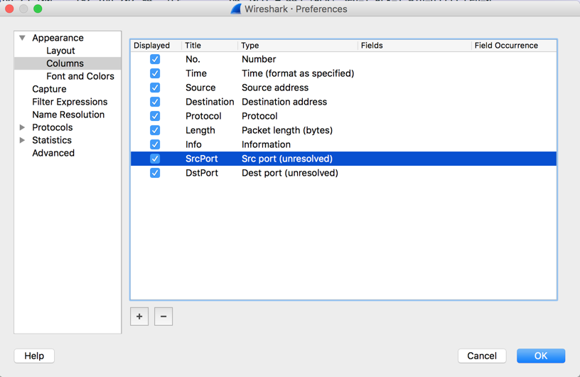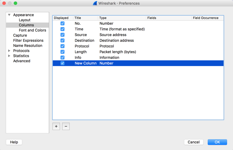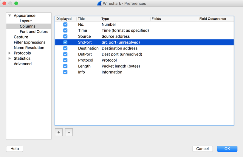 In the left pane of the "Wireshark - Preferences" window, in the Appearance section, click Columns. In the right pane, click a blank portion of the window.