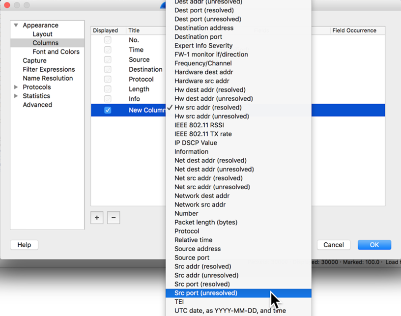 Arrows appear at the right of the field. Click the arrows. A long list of fields appears. Click "Src port (unresolved)", as shown below.