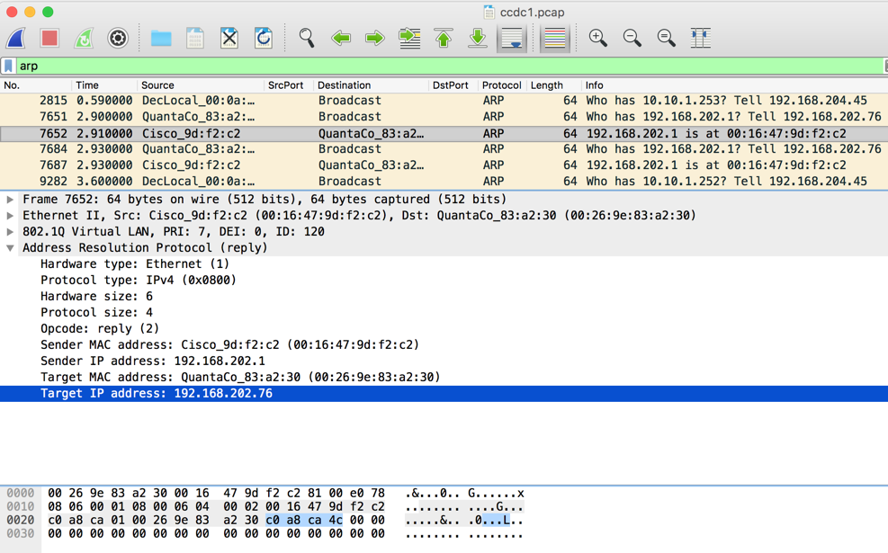 In the Packet List, click packet 7652. In the middle pane, expand the "Address Resolution Protocol (reply)" section and click "Target IP address".