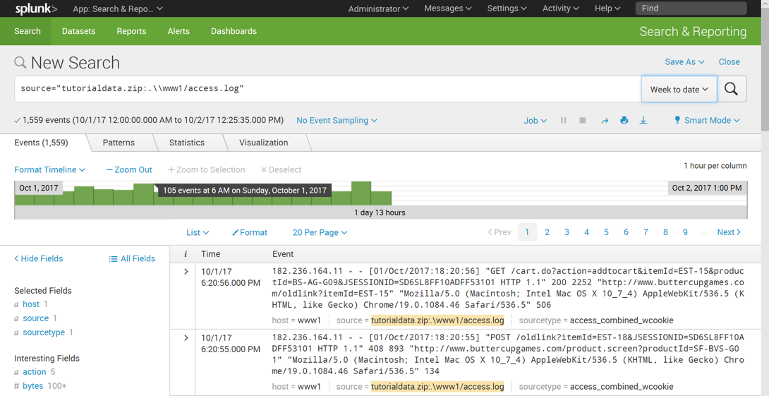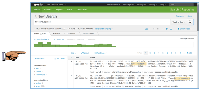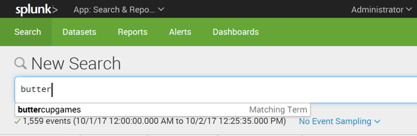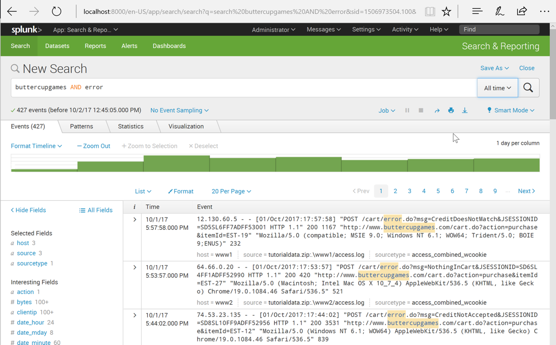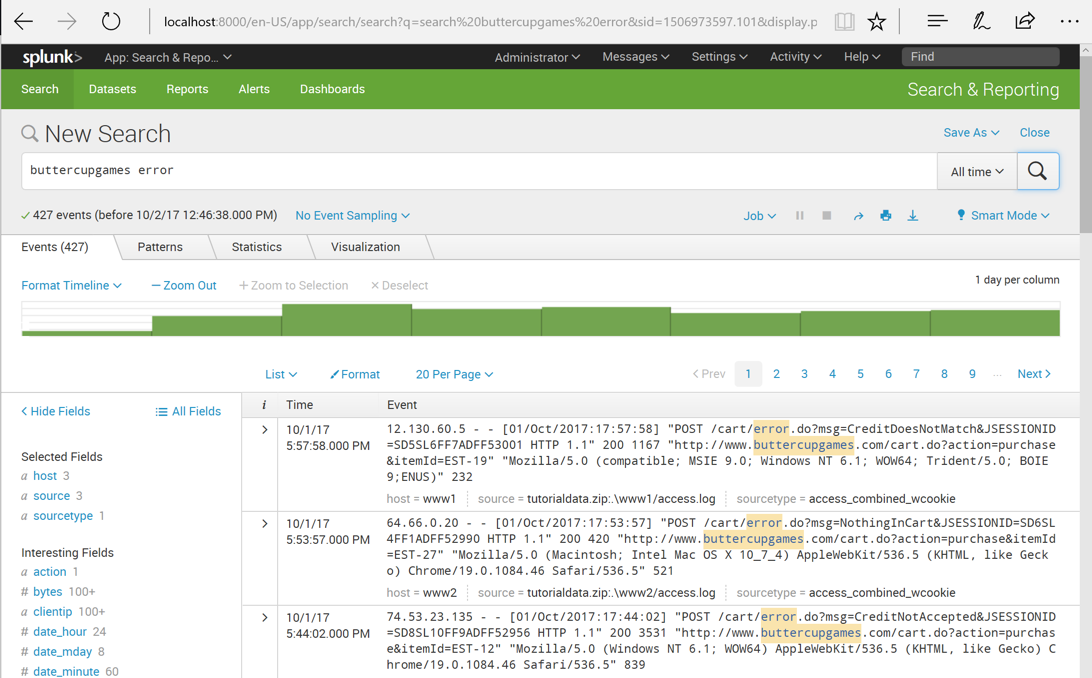 Splunk shows the matching records, highlighting the search term in the results, as shown below.
