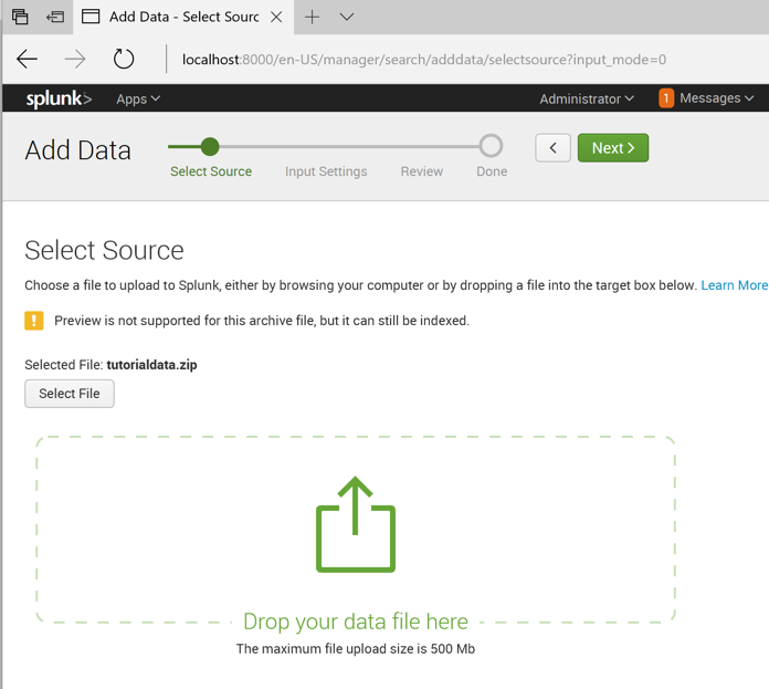 Drag the tutorialdata.zip file and drop it onto the "Select Source" page.