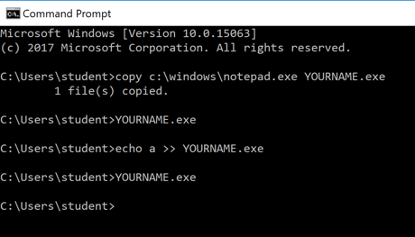 These commands copy cmd.exe to your home folder, run it, modify it by adding an "a" to the end, and run it again.