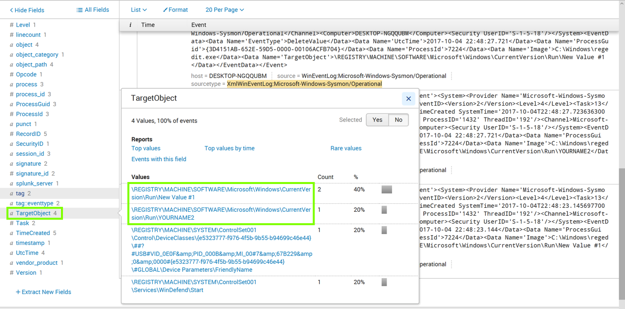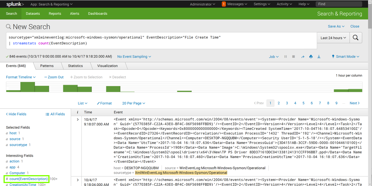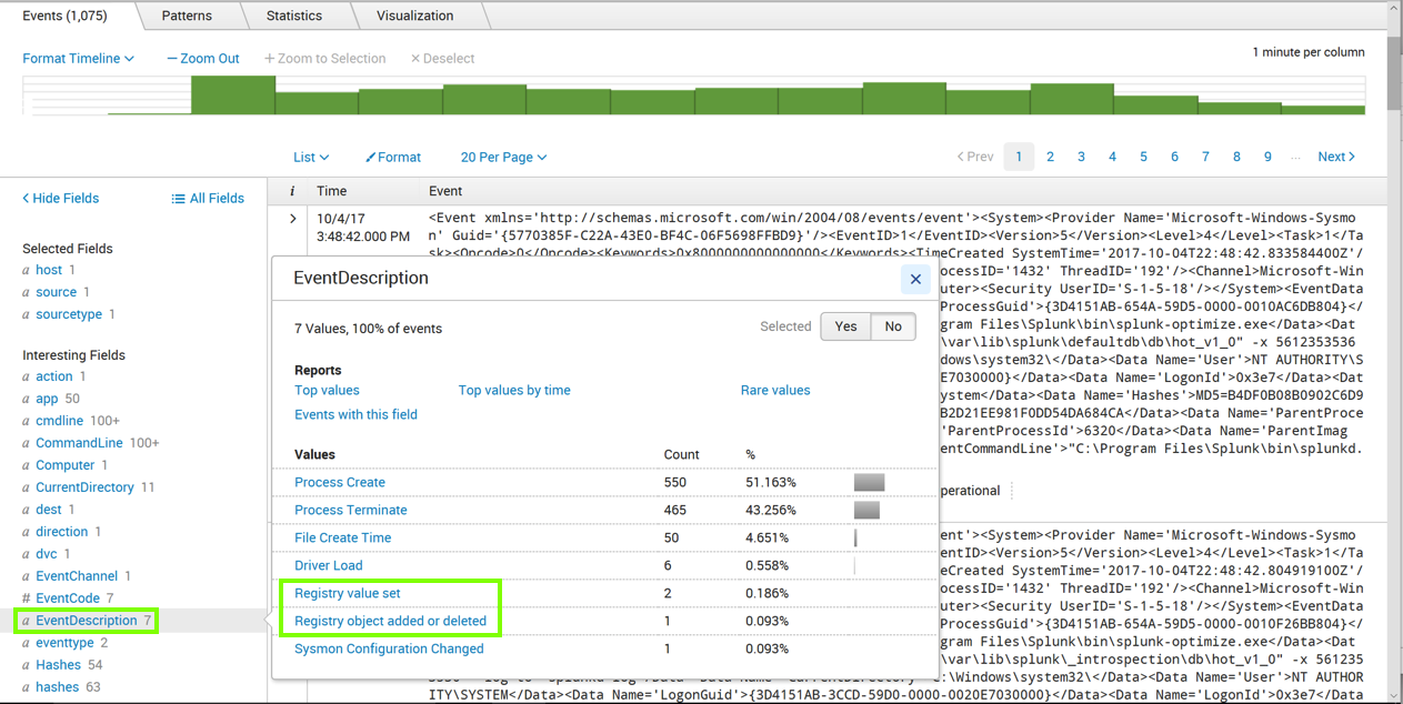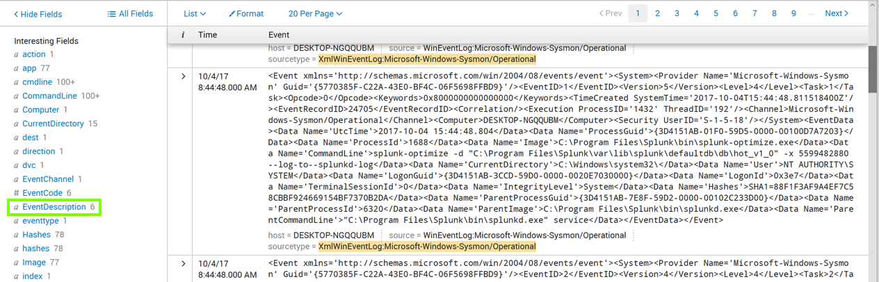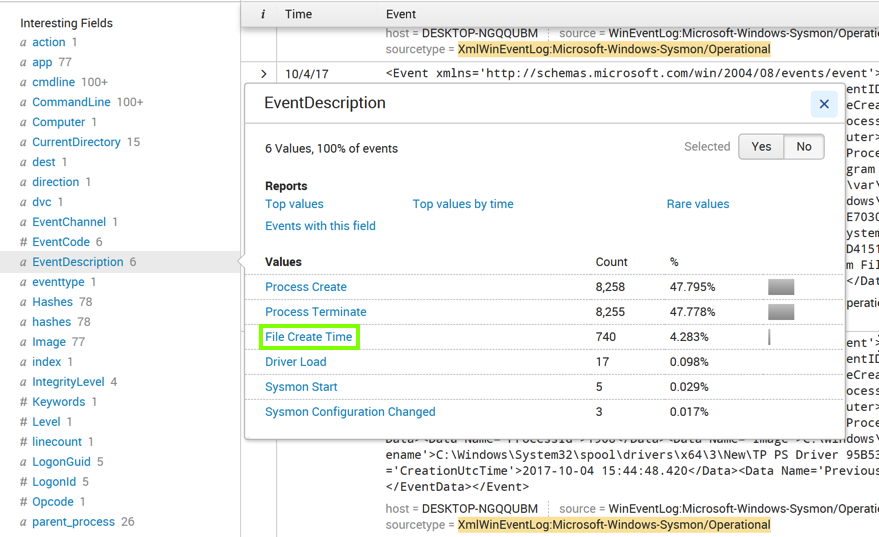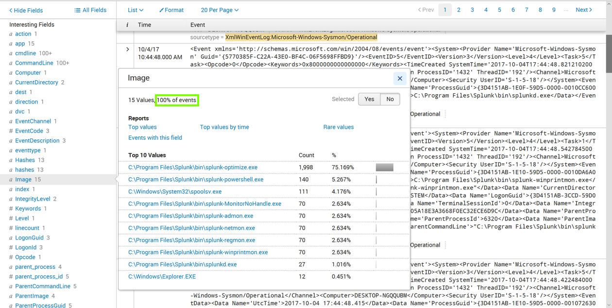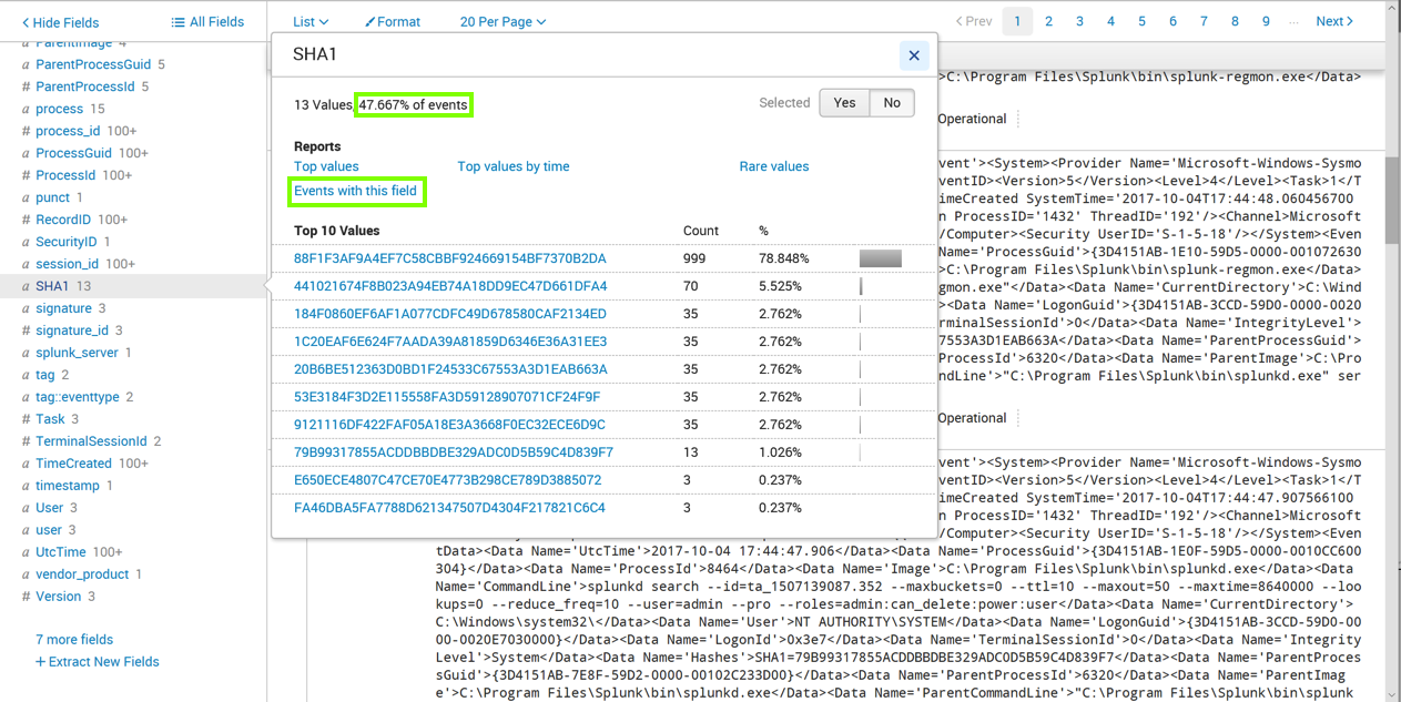 Notice the message outlined in green in the image above, saying "100% of events". This means that every Sysmon event contains this field.