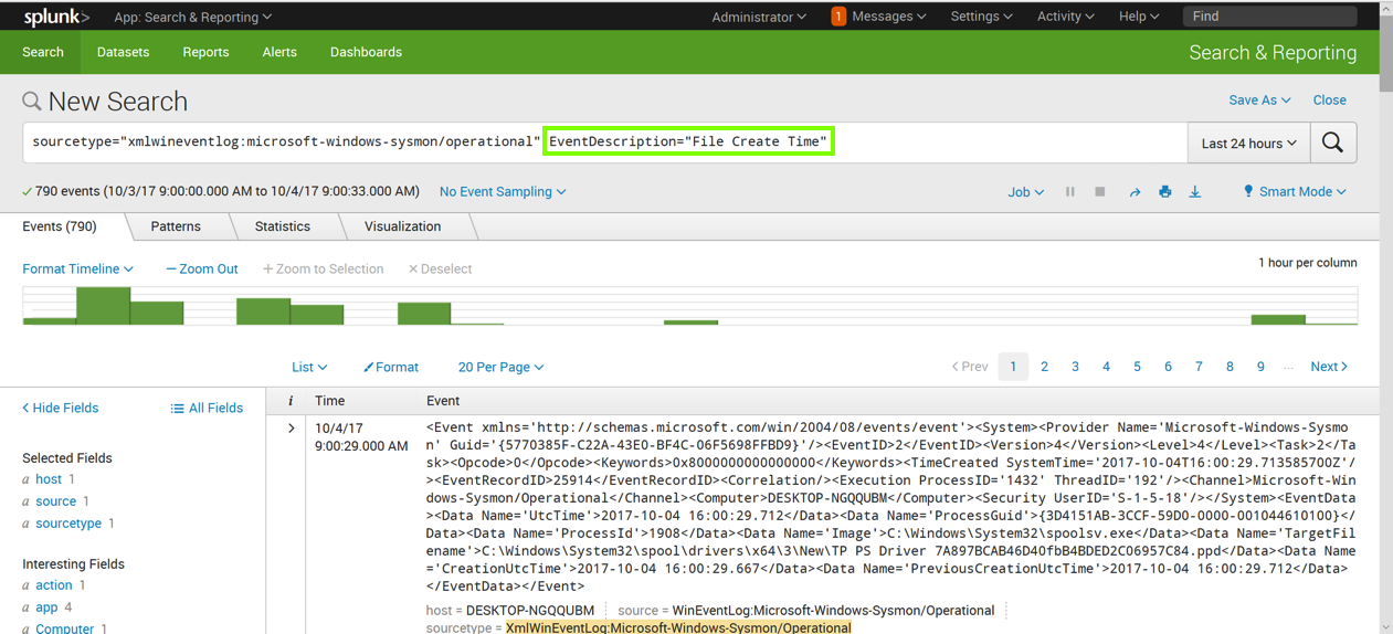 The Search page refreshes. Now the query is more specific, finding only events with EventDescription="File Create Time", as outlined in green in the image below.