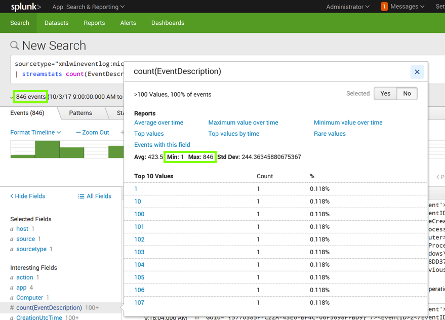 On the lower left, in the "Interesting Fields" section, click count(EventDescription).