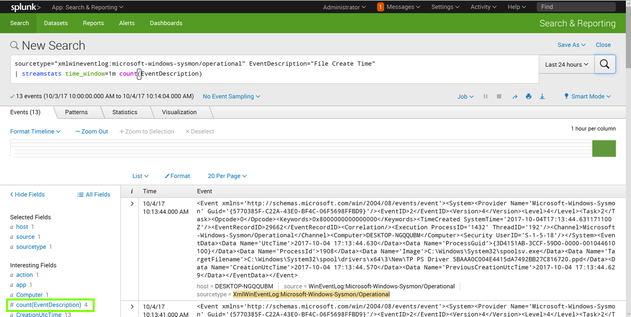 | streamstats time_window=1m count(EventDescription) AS "new_files"