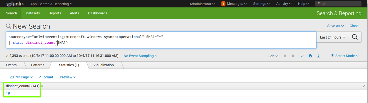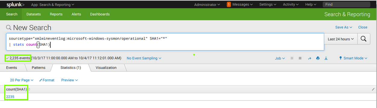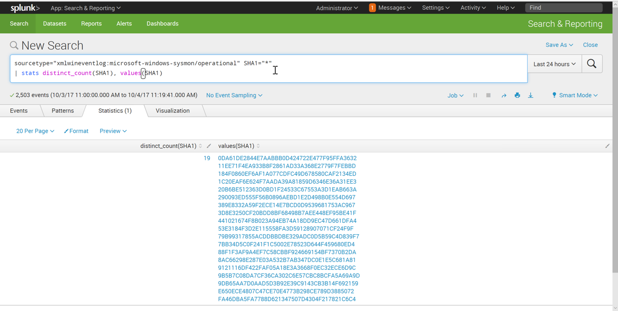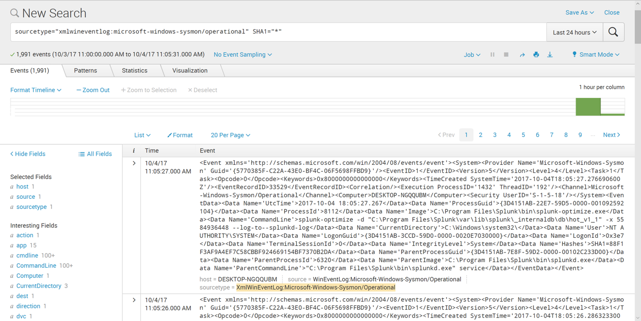 sourcetype="xmlwineventlog:microsoft-windows-sysmon/operational" SHA1="*"