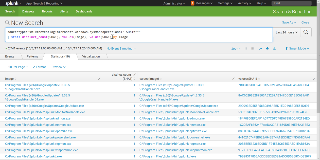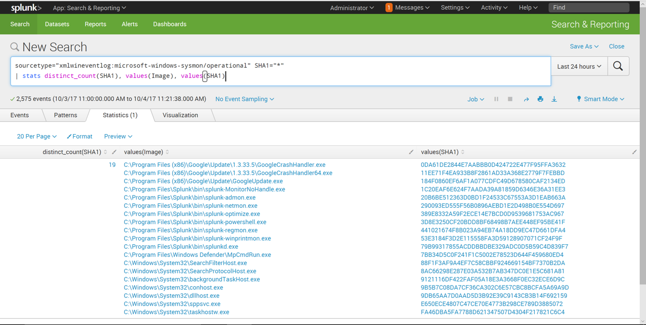 | stats distinct_count(SHA1), values(Image), values(SHA1) by Image