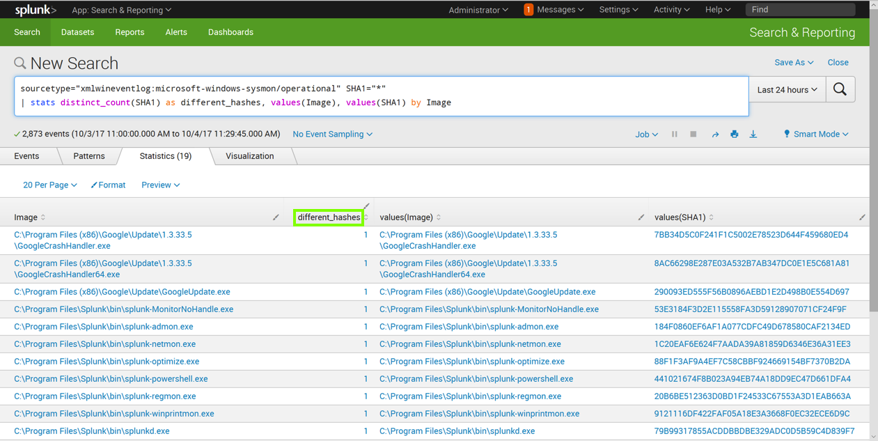 | stats distinct_count(SHA1) as different_hashes, values(Image), values(SHA1) by Image