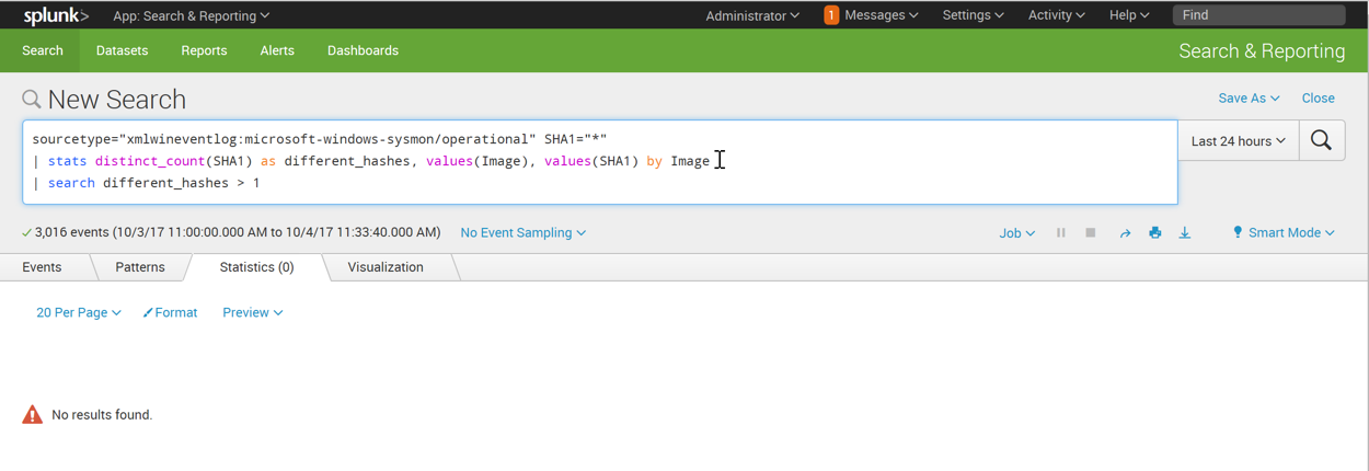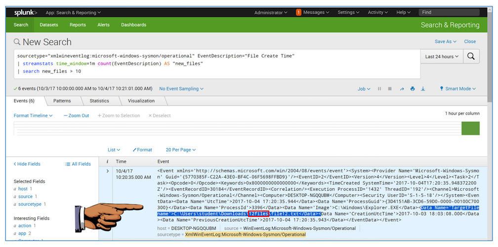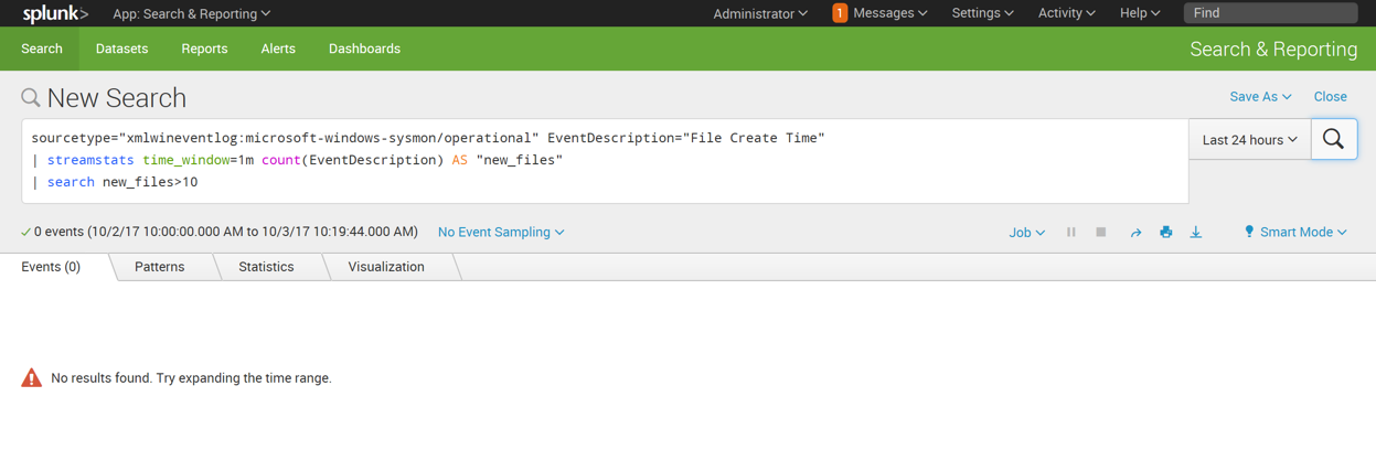 This search finds events in which more than 10 files are created in 1 minute. As shown above, there are no such events at the moment, so it reports "No results found".