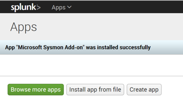 A message appears saying "App "Microsoft Sysmon Add-on" was installed successfully", as shown below.