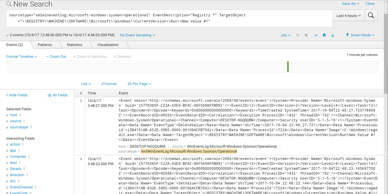 Notice the two events recording Registry Run key actions, outlined in green in the image above.