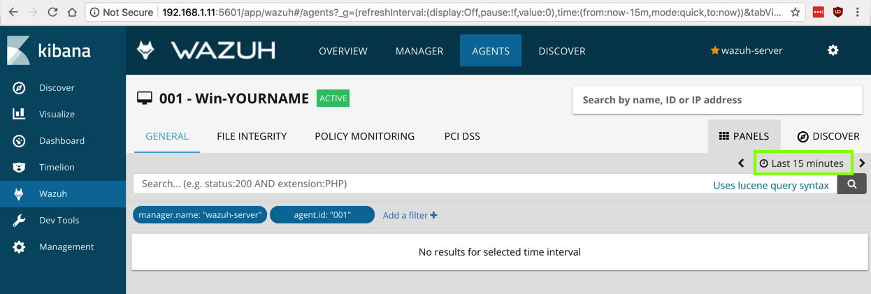 If you see no results, try changing the time interval.At the top right, click the time range, which may say "Last 15 minutes" or some other time range, as shown below.