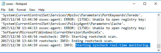 An "ossec - Notepad" window opens. Scroll to the bottom. You should see the message "Starting syscheck real-time monitoring", as shown below.