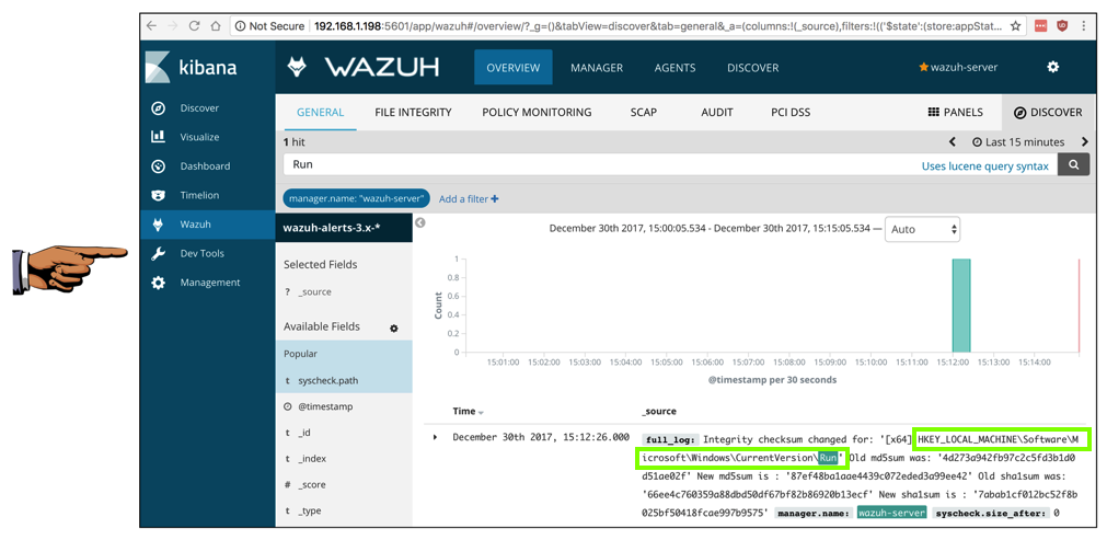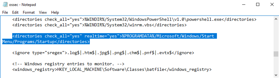 Scroll down to the "<!-- Windows registry entries to monitor. -->" line. A few lines above it, observe the line shown below.
