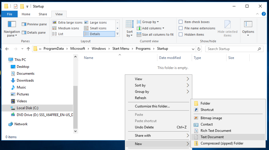 Right-click an empty portion of the window and click New, "Text Document", as shown above.