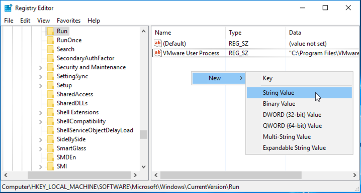 In the right pane, right-click an empty portion of the window and click New, "String Value", as shown above.