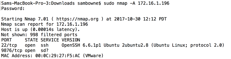 On your host computer, scan the SO virtual machine with nmap, as shown below. Replace the IP address with the IP address of your SO machine.