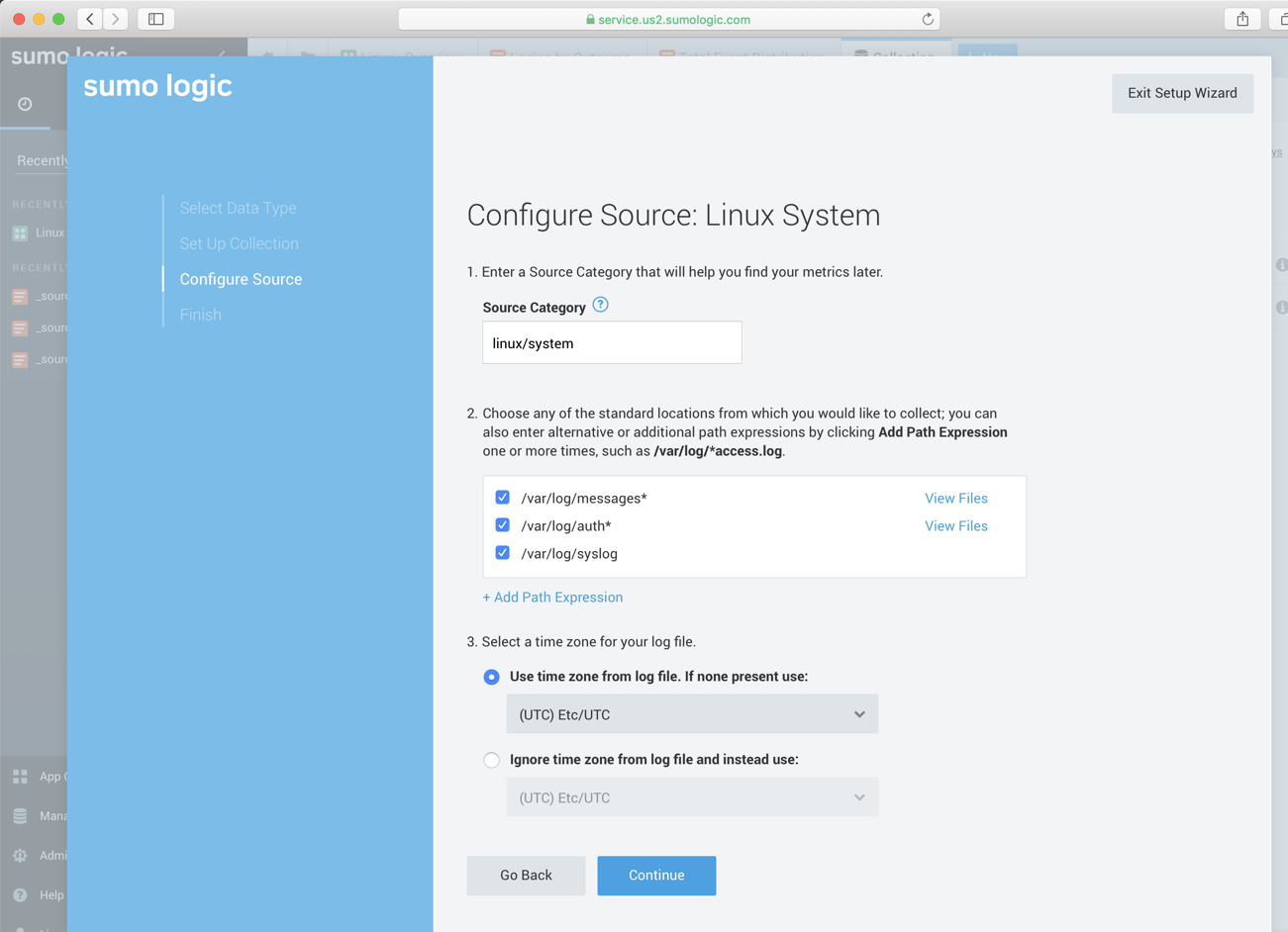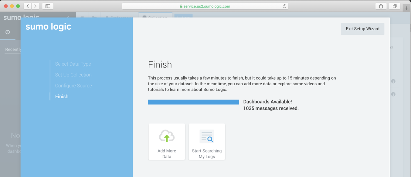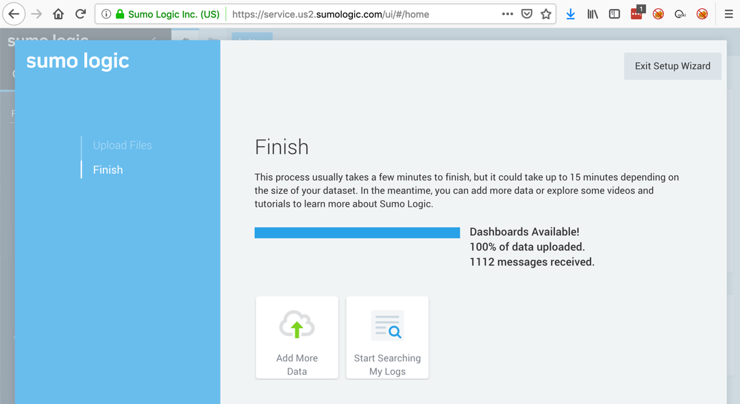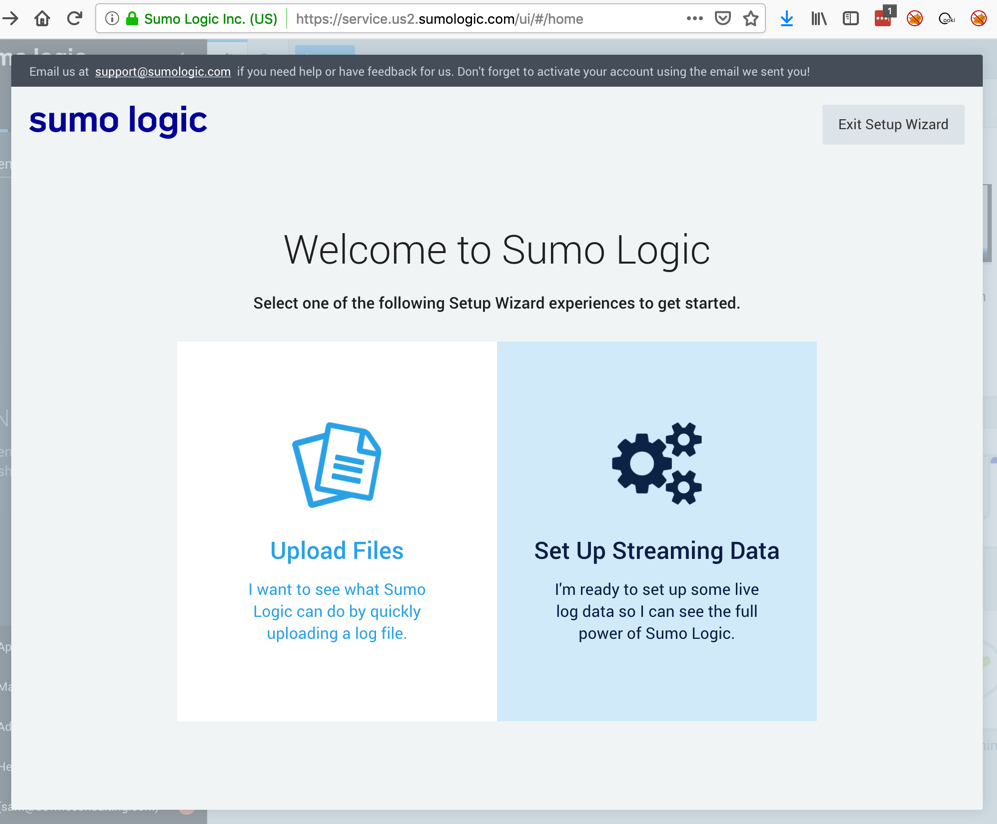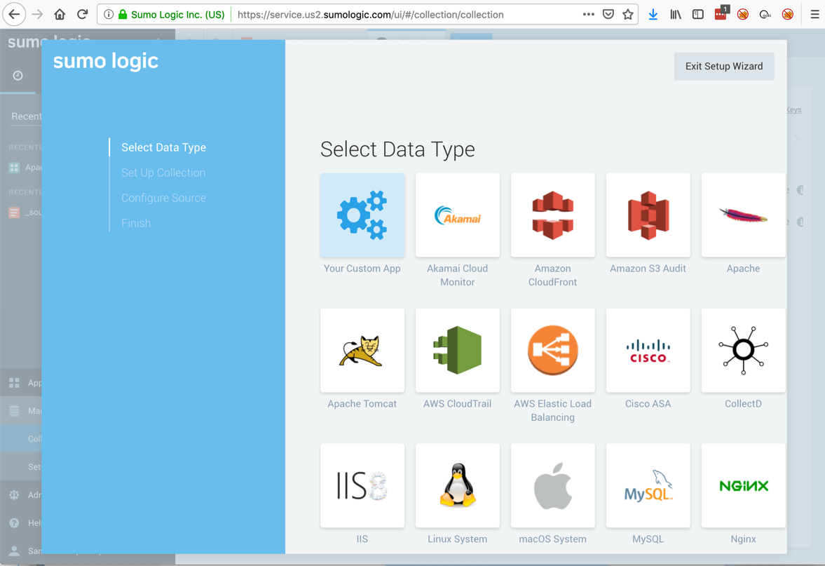 On the Sumo Logic web page, on the left side, in the black bar, at the bottom, click "Manage Data".