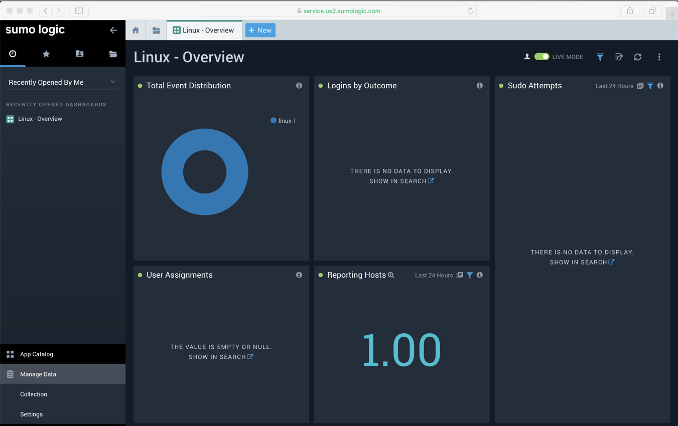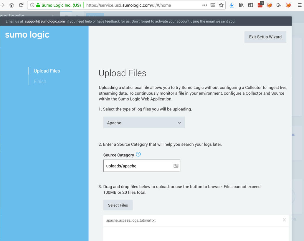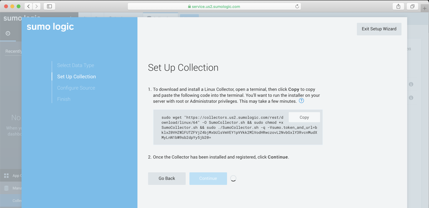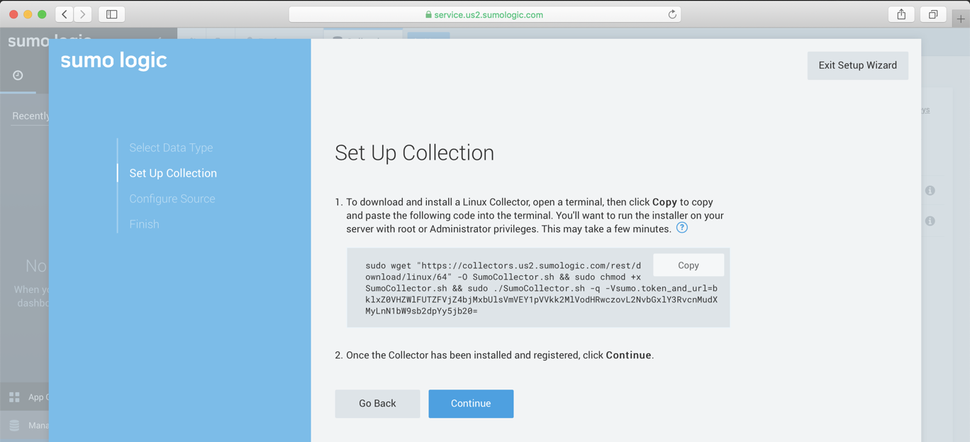 On the Sumo Logic web page, on the left side, in the black bar, at the bottom, click "Manage Data".