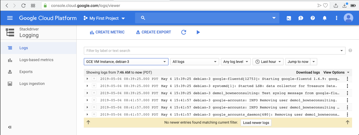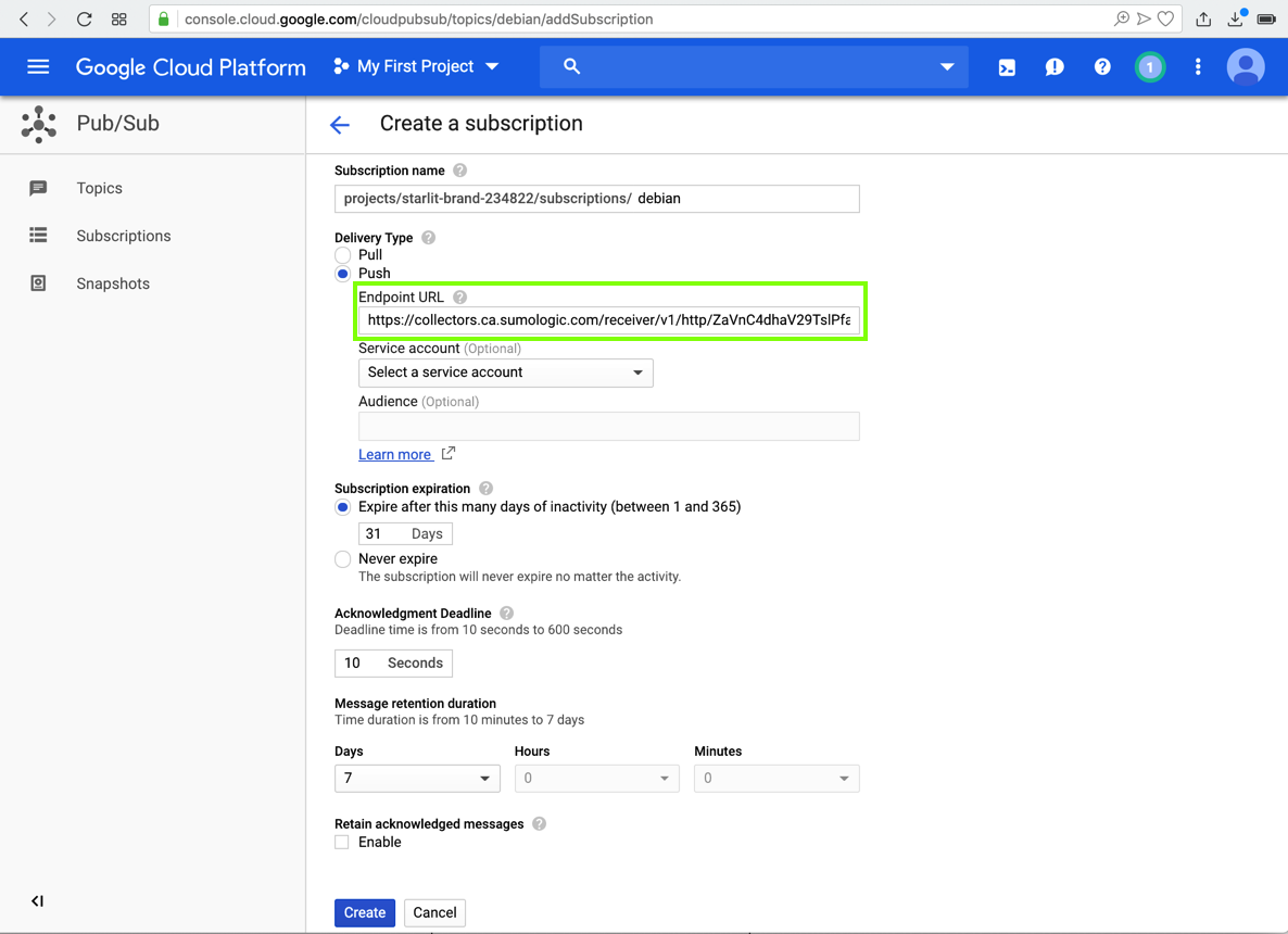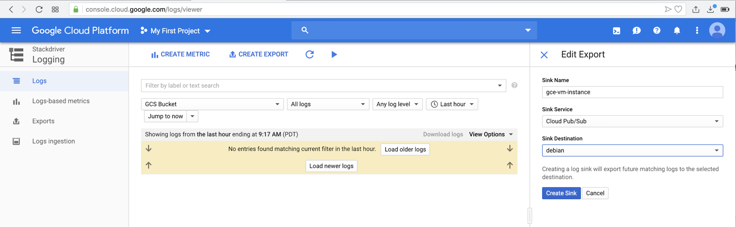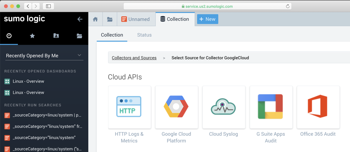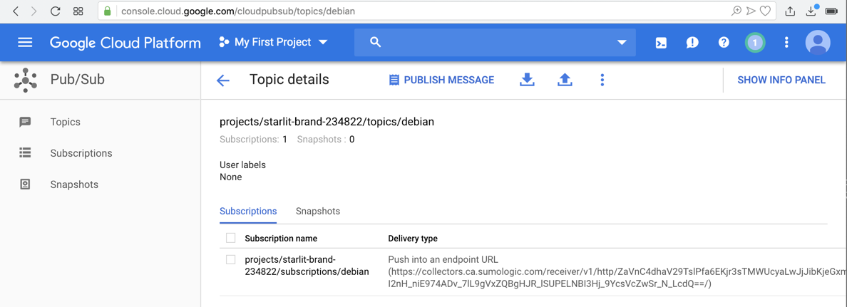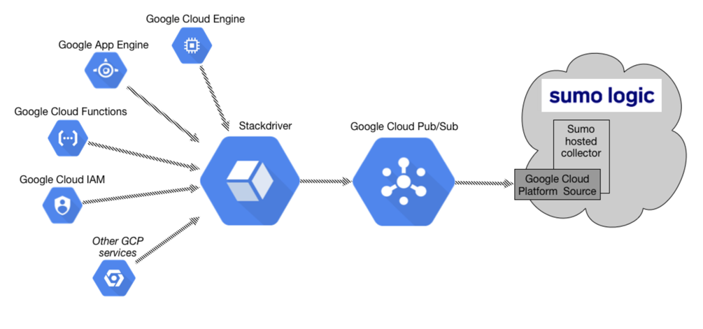 The key components in the collection process for GCP services are: Google Stackdriver, Google Cloud Pub/Sub, and Sumo’s Google Cloud Platform (GCP) source running on a hosted collector.The integration works like this: Google Stackdriver collects logs from GCP services. Once you’ve configured the pipeline shown below, the logs collected by Stackdriver will be published to a Google Pub/Sub topic. A Sumo GCP source on a hosted collector subscribed to that topic ingests the logs into Sumo.