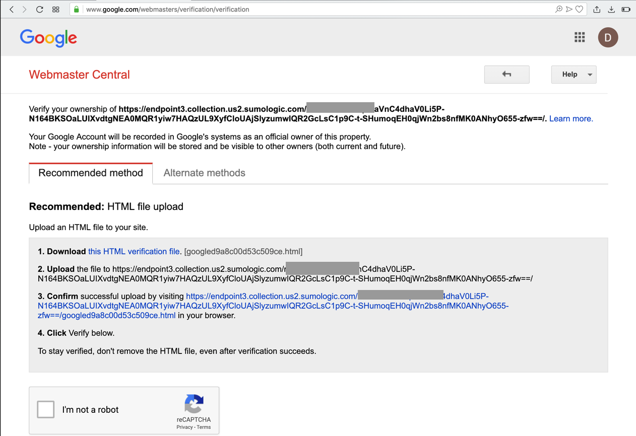 In the Sumo Logic page, paste in the Verification File Name and Verification File Contents, as shown below.