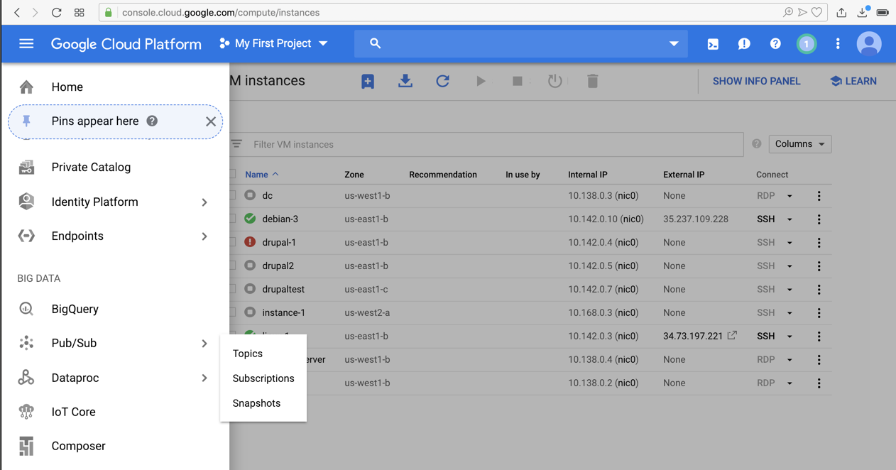 In the top left drop-down list, select "GCE VM Instance", debian.