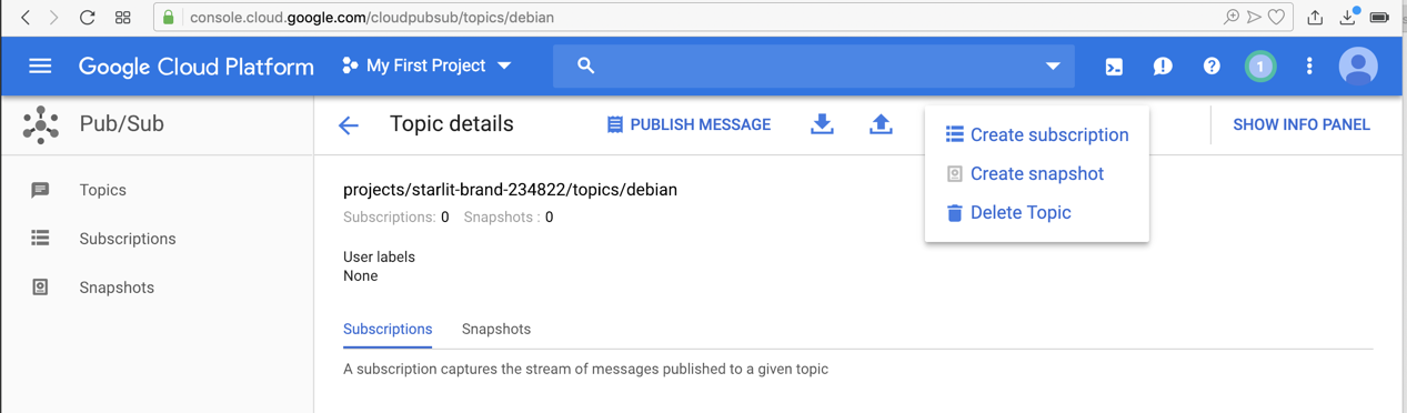 On the "Topic details" page, at the top center, click the three-dot icon and click "Create subscription", as shown below.