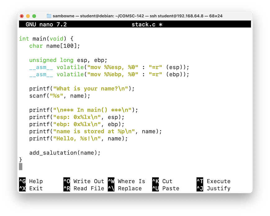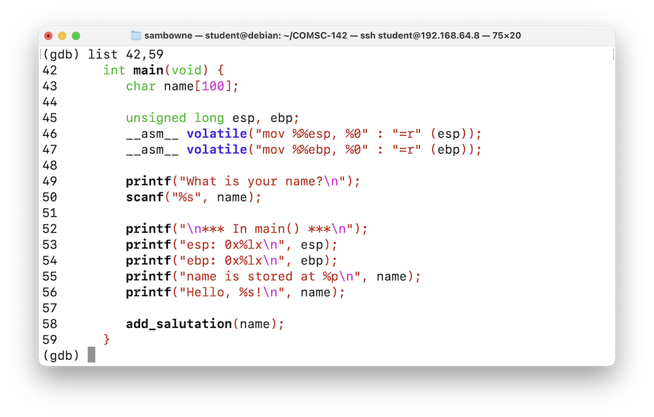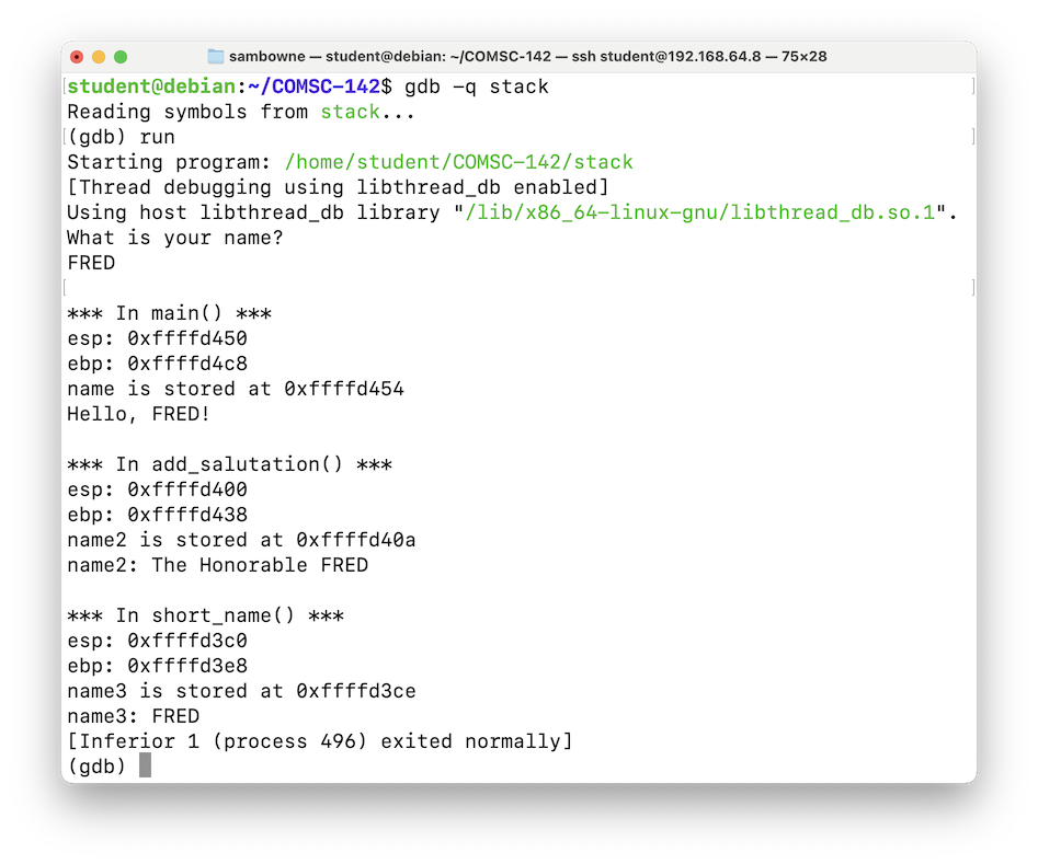 Notice that the name you entered, AAAA, appears in the stack frame, as its hexadecimal encoding, 41414141, outlined in red in the image below.