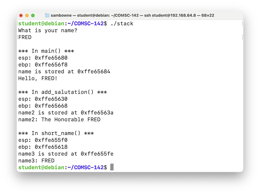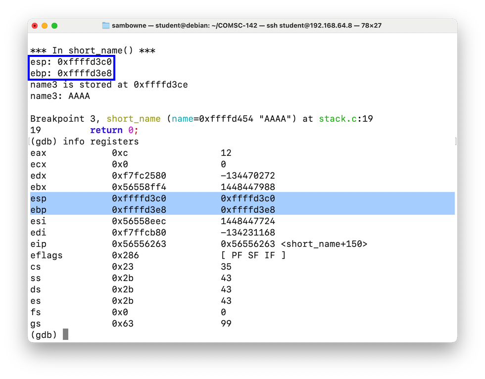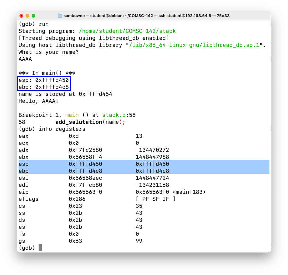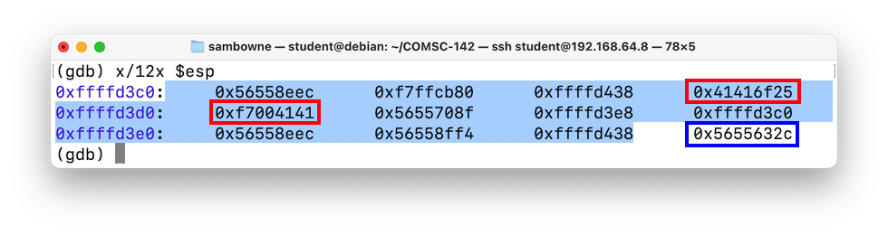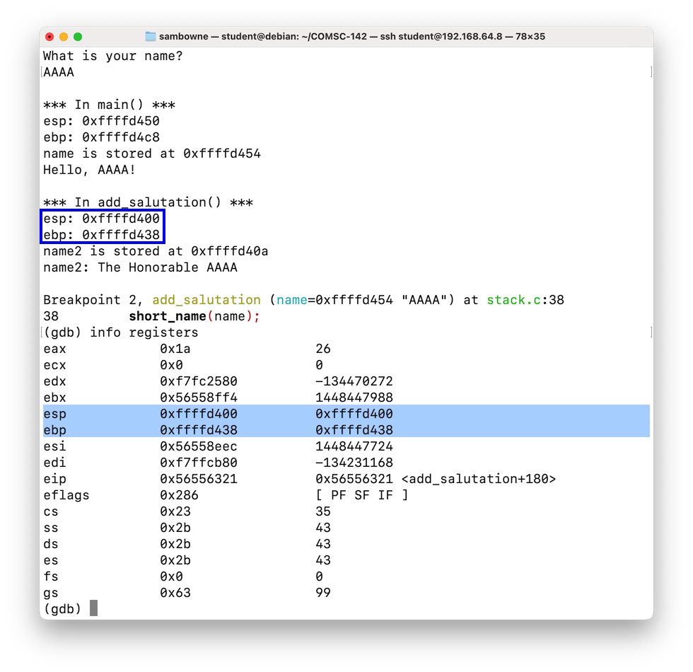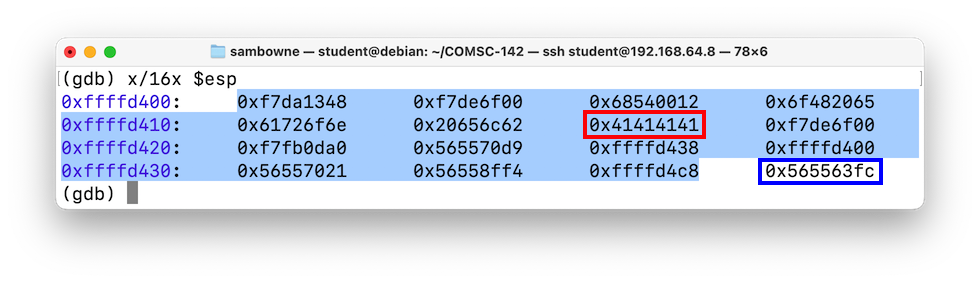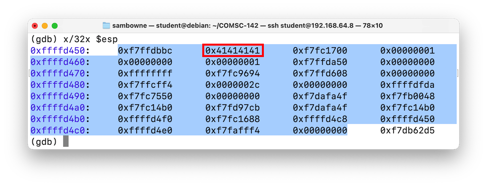 Notice that the name you entered, AAAA, appears in the stack frame, as its hexadecimal encoding, 41414141, outlined in red in the image below. It's in two adjacent words.
