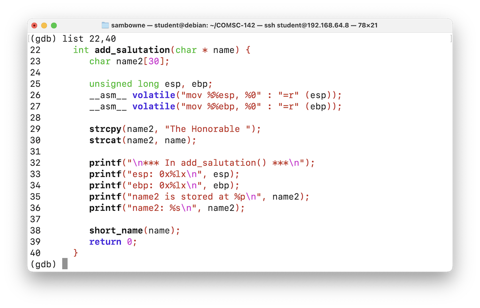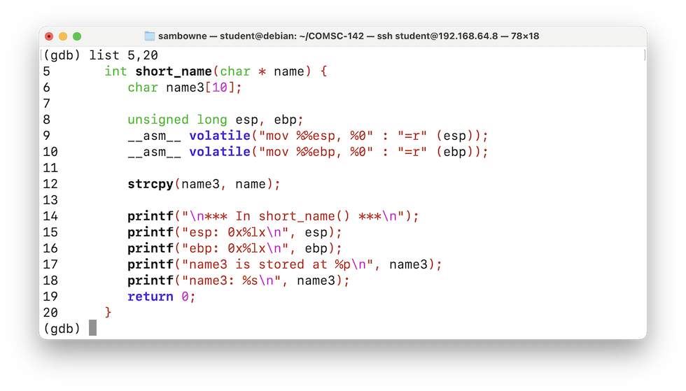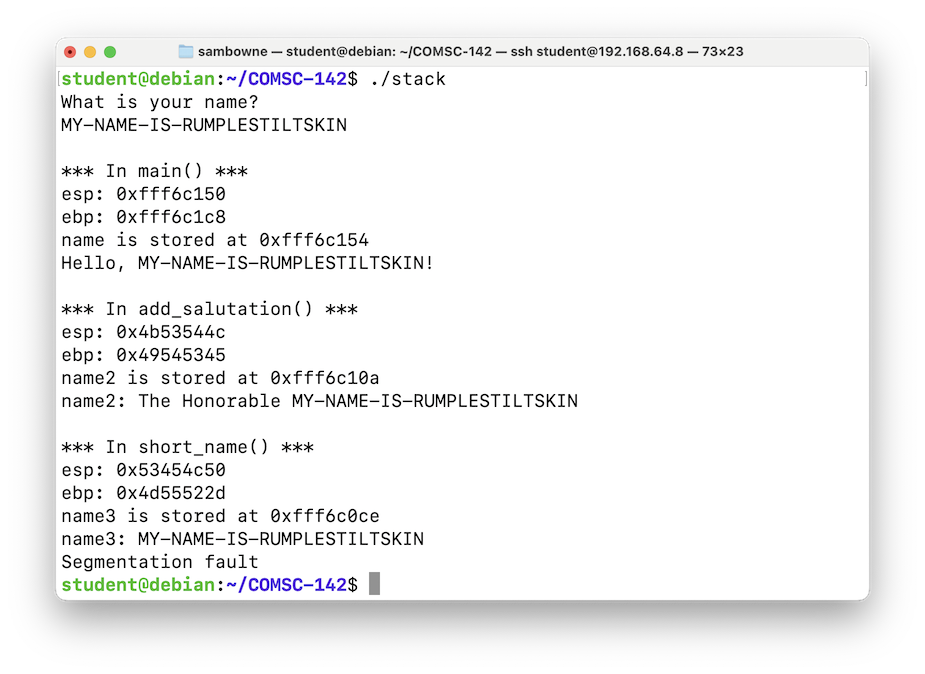 MY-NAME-IS-RUMPLESTILTSKINThe program proceeds through the add_salutation() function, and crashes in the short_name() function, as shown below.