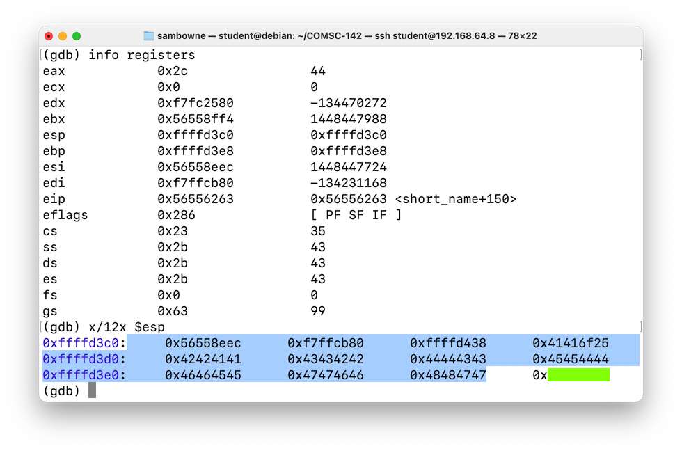 run y AAAABBBBCCCCDDDDEEEEFFFFGGGGHHHHIIII info registers x/12x $esp